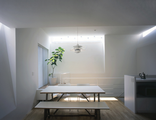 周囲を建物に囲まれた敷地にたつ住まい。フラップ状に壁を上方に切り開き、その隙間から光を室内へ導く。採光換気のための窓をそれぞれ機能的に確保した明るく開放的な住まい。レリーフ状のフラップの傾斜した壁は空間を面積以上に広く感じさせます。床のスキップによってスペースの区分けをし「1枚の床=1つの場所」として、一体の空間に光と空気が床の隙間を通して、家族の気配とともに柔く全体に広がっていく。